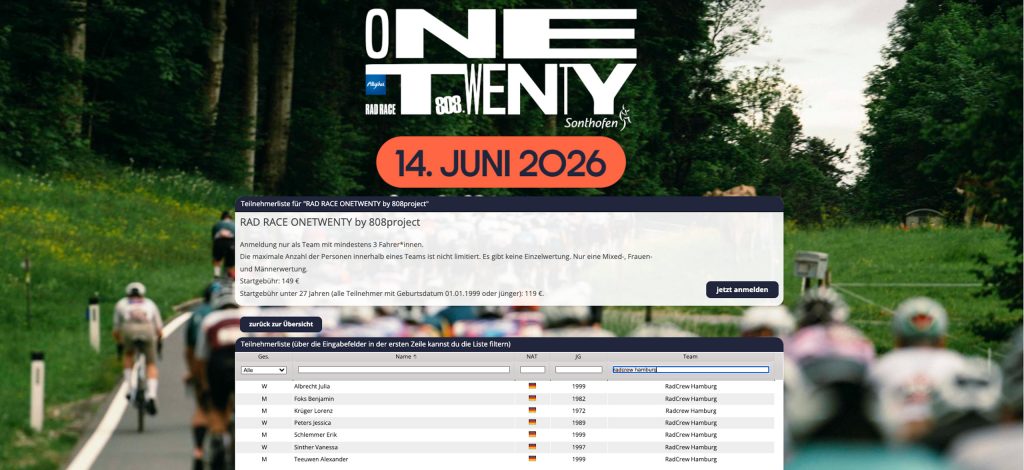 Bereits zum dritten mal in Folge ist ein Teil des RadCrew Hamburg Raceteams am Start beim Radrace 120 in Sonthofen. Mit einem Team aus 3 starken Ladies, 3 Raketen und einem Oldie repräsentieren wir Hamburg City und unseren Spirit.